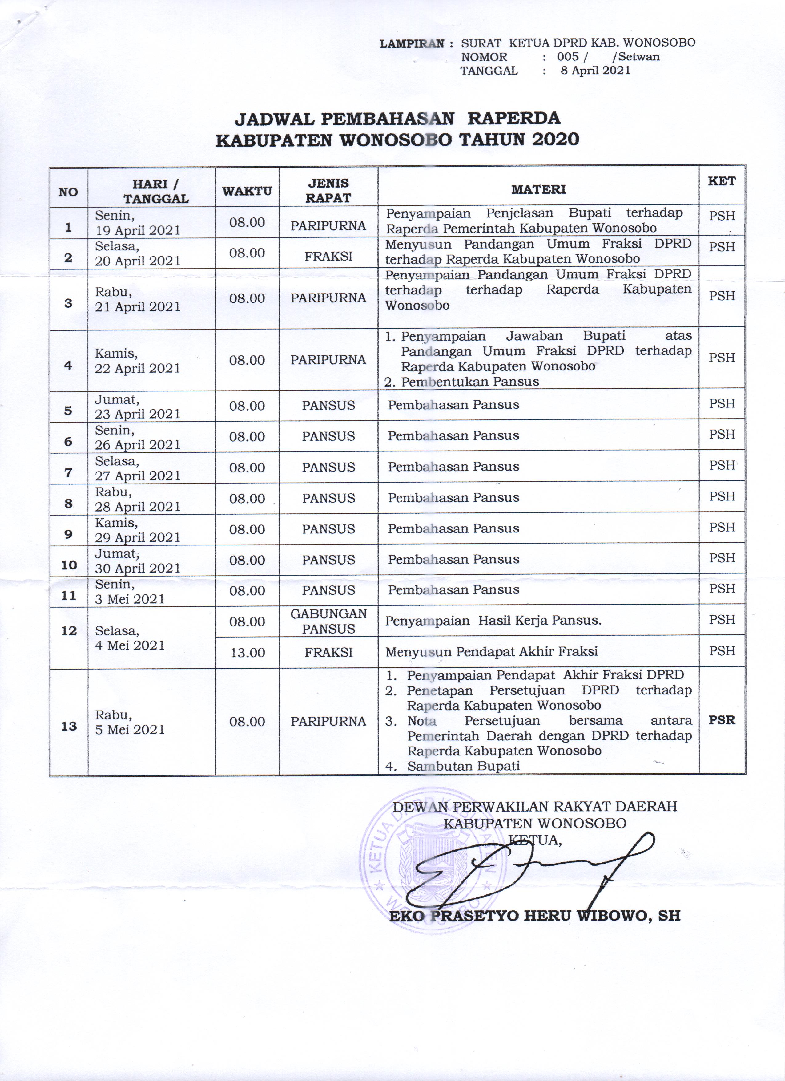 JADWAL PEMBAHASAN RAPERDA KABUPATEN WONOSOBO TAHUN 2021