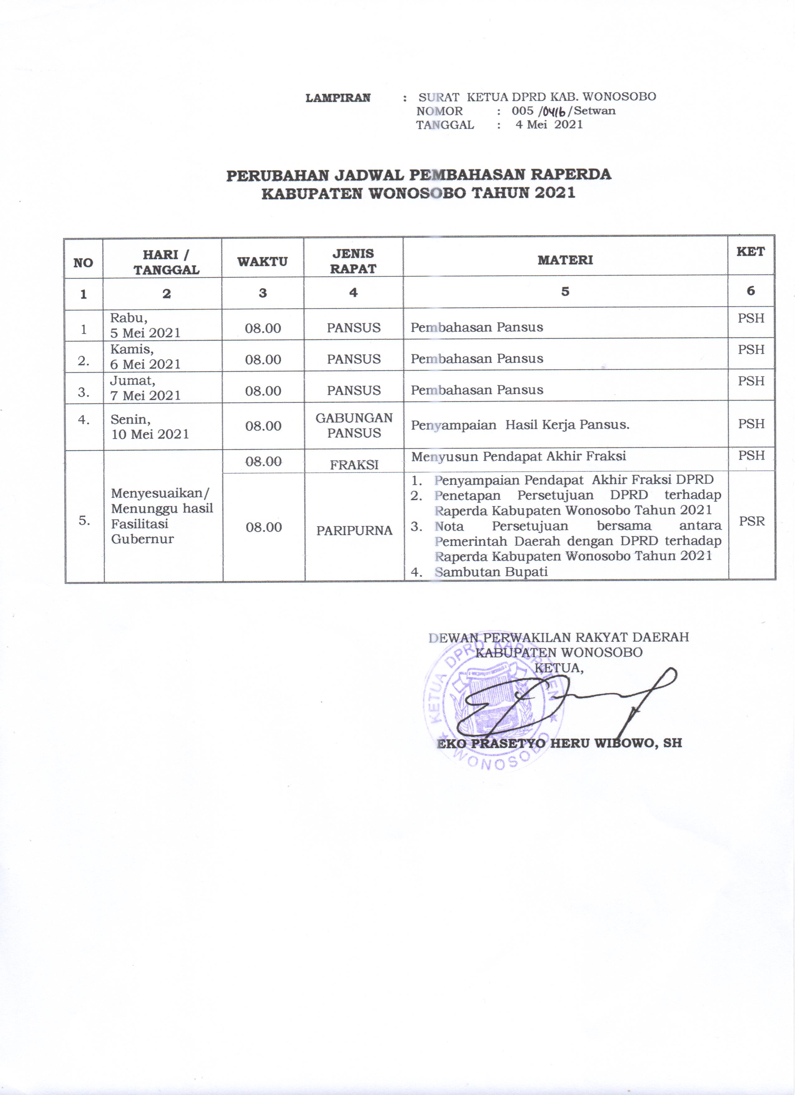 PERUBAHAN JADWAL PEMBAHASAN RAPERDA RPJMD KABUPATEN WONOSOBO TAHUN 2021-2026