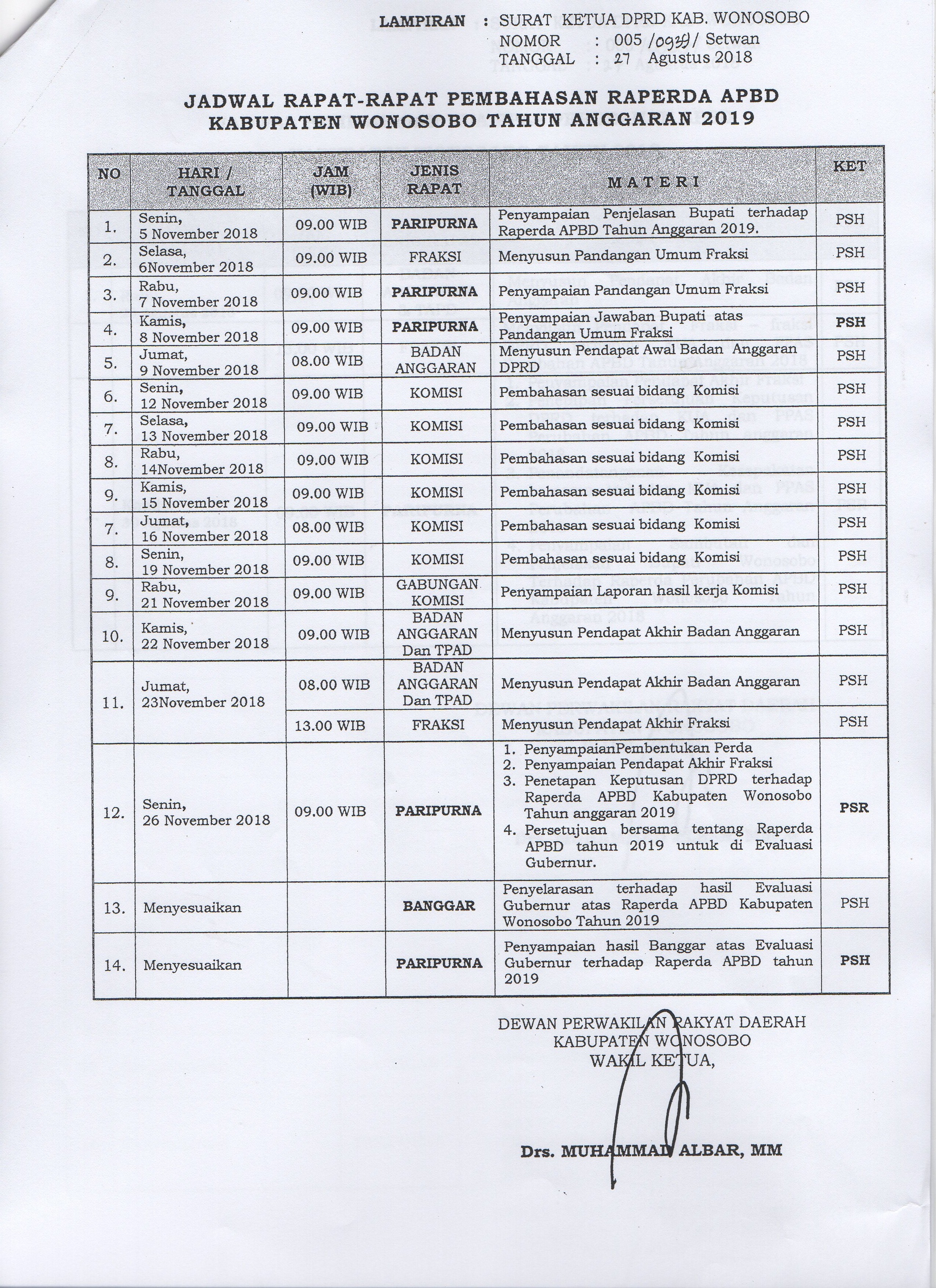 Jadwal Rapat-Rapat Pembahasan RAPERDA APBD Kabupaten Wonosobo Tahun Anggaran 2019