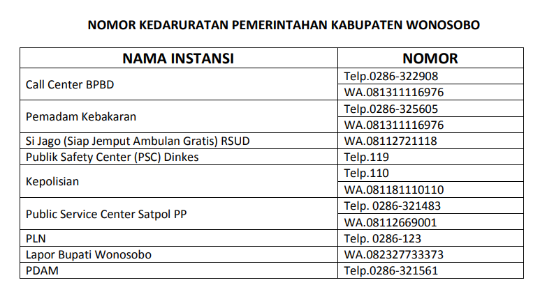 Nomor Penting Layanan Kedaruratan Pemerintah Kabupaten Wonosobo